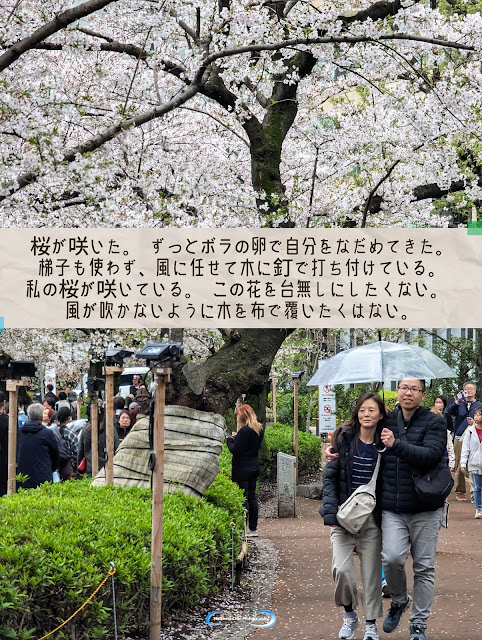 櫻花開了。這段時間我一直靠著鯔魚蛋安慰自己。我甚至都沒用梯子,只是把它們釘在樹上,讓風吹動。我的櫻花盛開了。我不想毀了這些花。我不想用布蓋住樹擋風。
